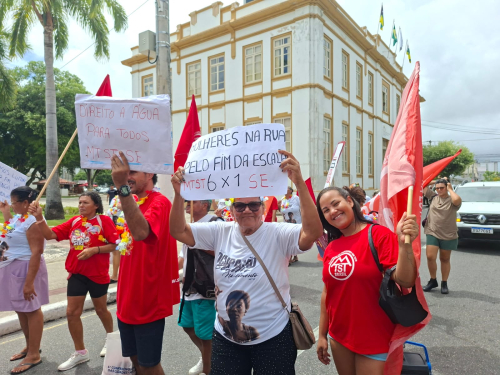 Com galões de água e baldes vazios, as lideranças sindicais denunciaram a privatização da água de Sergipe, que piorou muito o serviço de abastecimento de água nas residências, deixando a população sem este bem essencial para a vida.