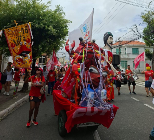 “A conta está paga, mas na torneira não cai uma gota. Cadê a água, Iguá? Estamos na luta também porque não podemos continuar num regime de trabalho que não garante, no mínimo, dois dias de descanso para a classe trabalhadora viver com direito ao lazer, à família. Dois dias para vivermos do jeito que quisermos. Então é isso que queremos com este carnaval: é luta sim, é felicidade também. Mas sempre com consciência de que nós vamos continuar lutando por cada conquista para a classe trabalhadora”, discursou o professor Benizário Júnior do município de Lagarto.