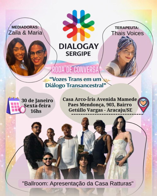 No dia 30 de janeiro, às 16h, na Casa Arco-íris, vai acontecer a Roda de Conversa "Vozes Trans em um Diálogo Transancestral", com as mediadoras Zaila Luz (Pedagoga e pesquisadora da área de Educação sobre Justiça Social) e Maria Luz (Pedagoga e militante pelos direitos da População Trans e Travesti).